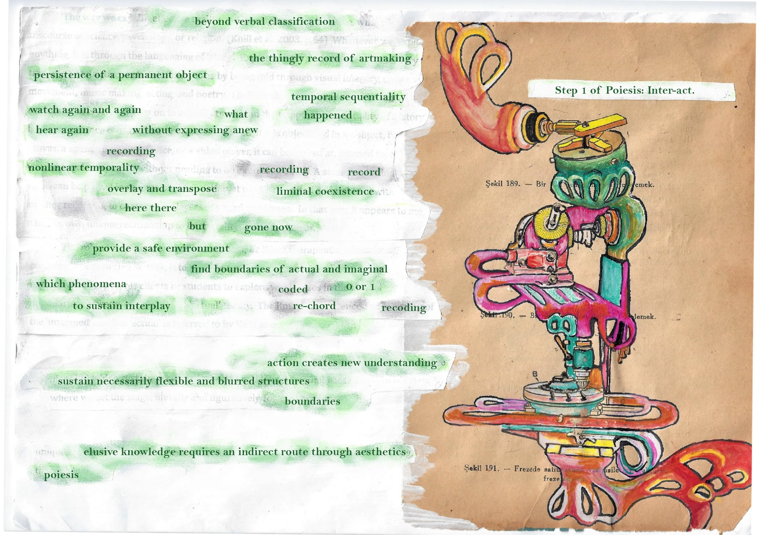 As an Expressive Arts Consultant for interdisciplinary students, I conduct sessions based on the phenomenological methodology of the European Graduate School. The approach of this methodology is ‘intermodal’, structured around guiding clients through multiple art forms in one session (visual, audio, verbal, kinaesthetic, performative) as a means of ‘decentering’ from habitual ways of thinking and perceiving. I also incorporate into our sessions the work and approaches of historical and contemporary artists who explored topics similar to yours. My work is rooted in the belief that the study of elusive knowledge relies on an indirect route through aesthetics and experience. As an Expressive Arts-based Academic Consultant, I provide the framework for discovery for my clients rather than the content of that discovery, thus promoting ‘poiesis’: an act of creative making which brings a new understanding into being that did not exist before.